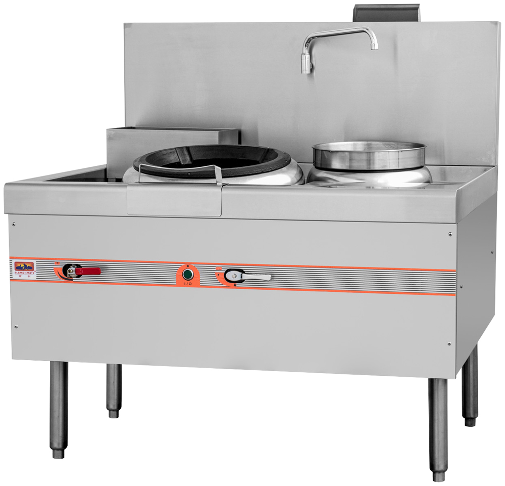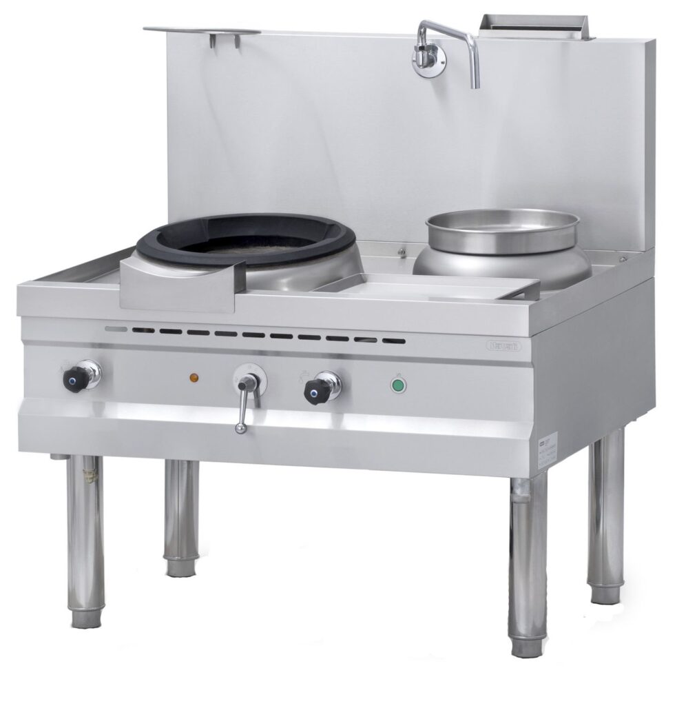 A premium wok range tailored for efficiency and safety. It features a deep-drawn dome top, integrated wok holder, and ergonomic wall-mounted faucet with knee-level lever control. Fully compatible with other 125-series wok ranges — designed for flexibility and seamless kitchen integration.